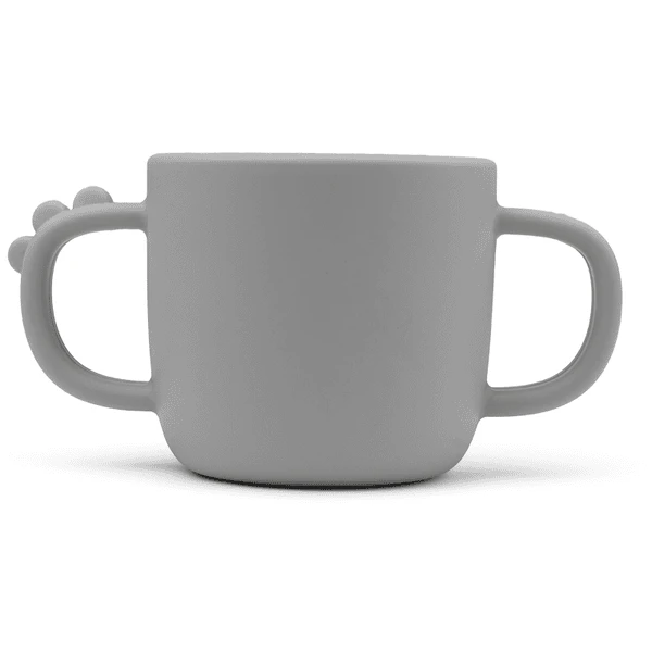 Krokodils am Henkel. Der Becher ist in einem weichen Grauton gehalten, passend